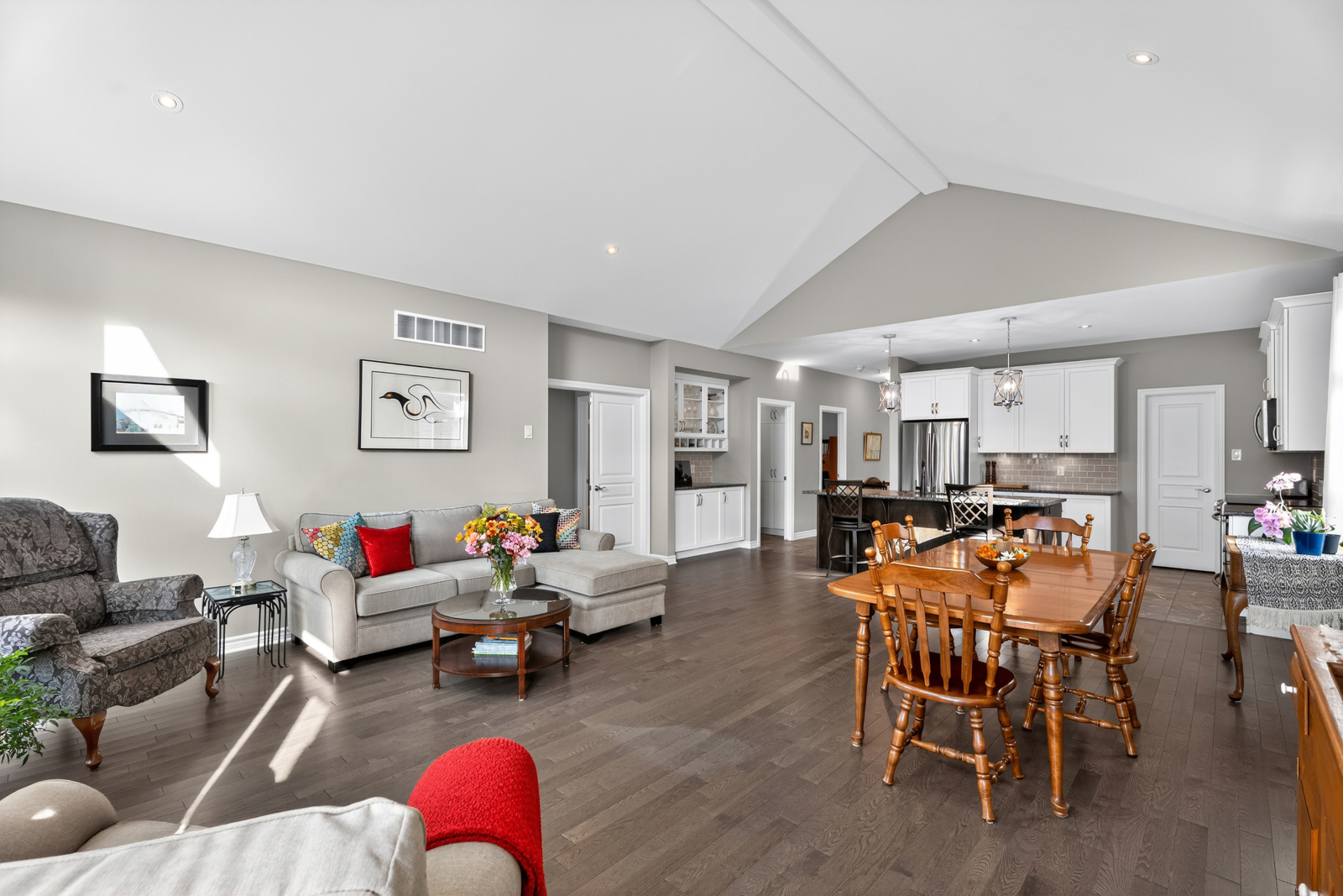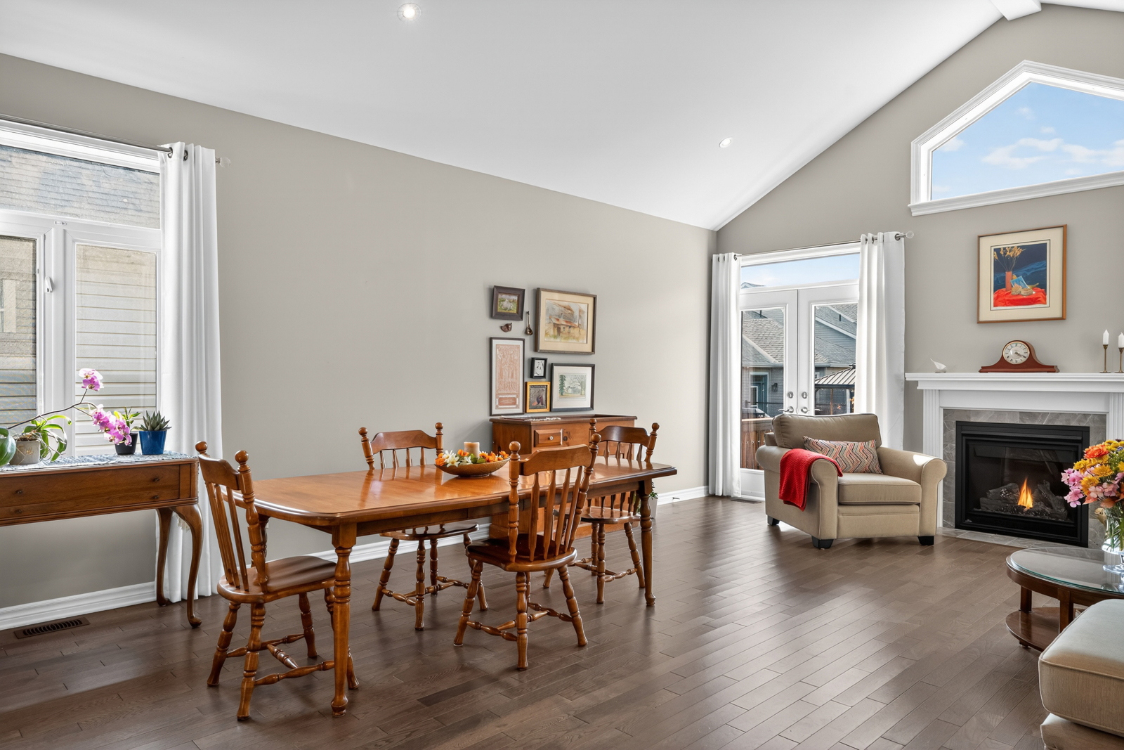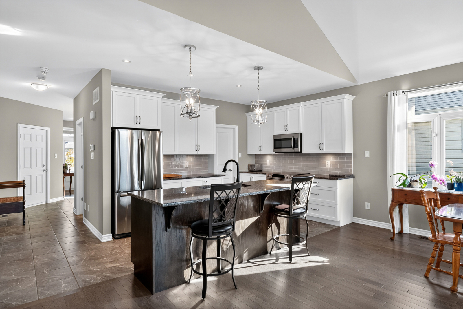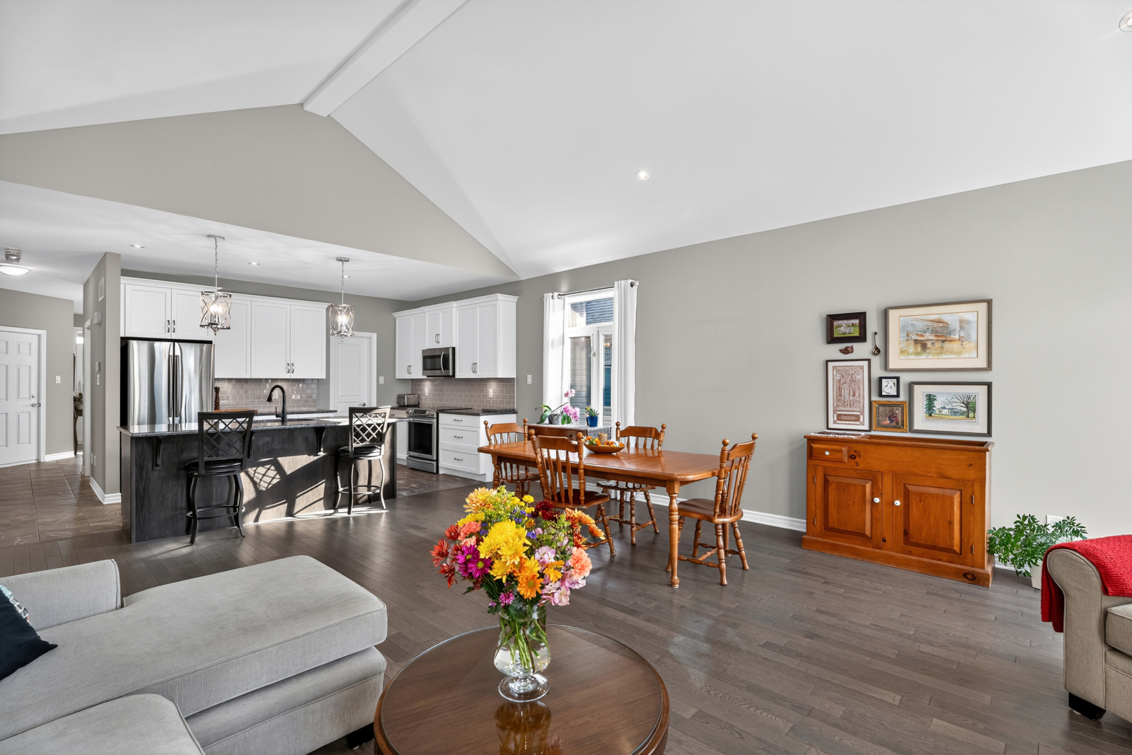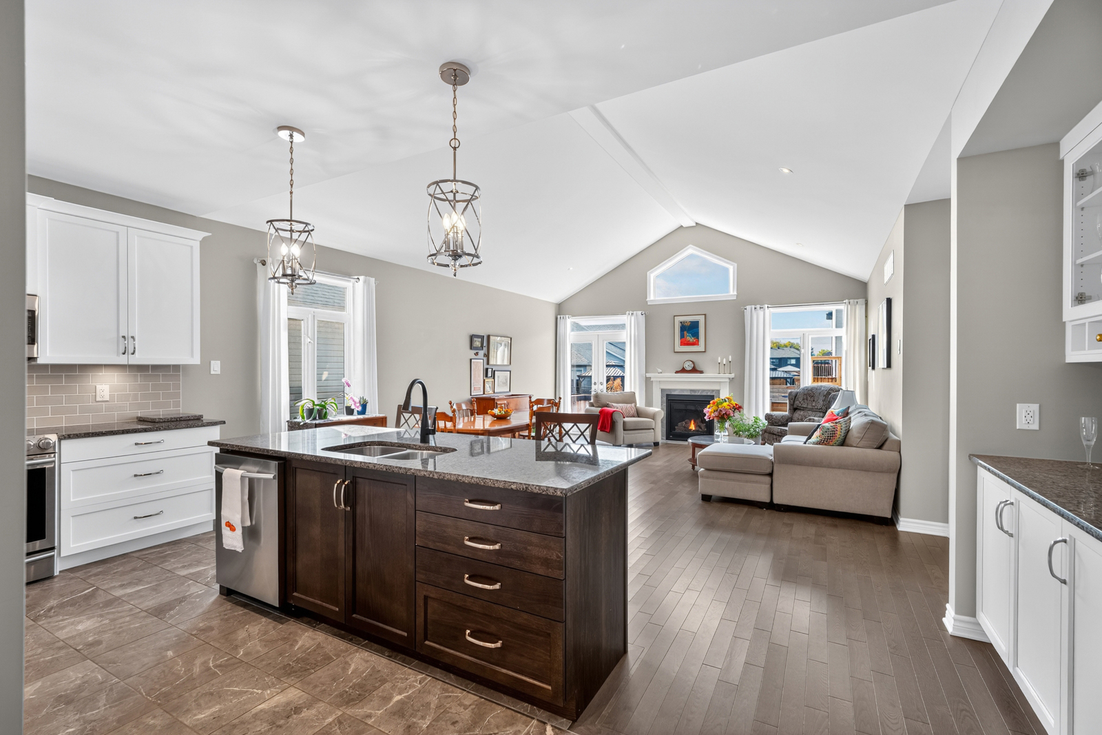 Step inside and discover 1,640 sq. ft. of stylish main floor living with vaulted ceilings, rich hardwood floors, and a cozy gas fireplace anchoring the open-concept design. The chef's kitchen features two-tone cabinetry, granite countertops with a breakfast bar, undercabinet lighting, stainless steel appliances, a walk-in pantry, and a handy alcove with additional cabinetry, perfect for storage or a coffee bar. The main floor offers a thoughtful layout with a primary suite featuring a walk-in closet and a 3-piece ensuite with a stand-up shower. A second bedroom also includes a walk-in closet, while a den at the front of the home makes an ideal office, TV room or reading nook. Another full bathroom, main-floor laundry, and a welcoming covered front porch add to the functionality.