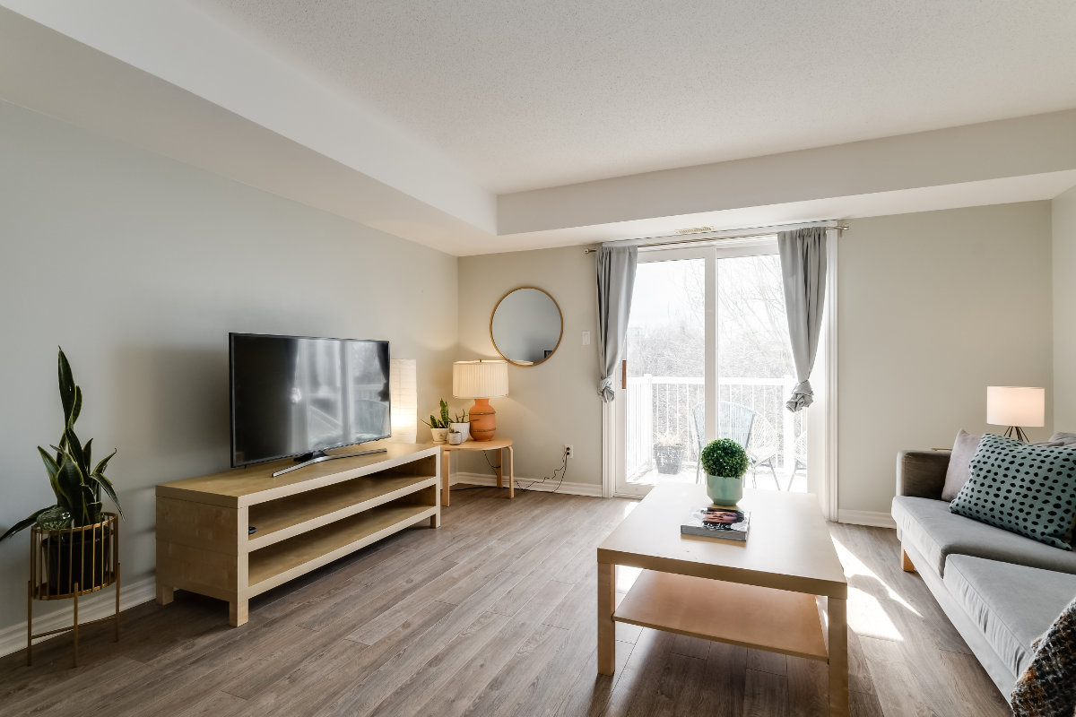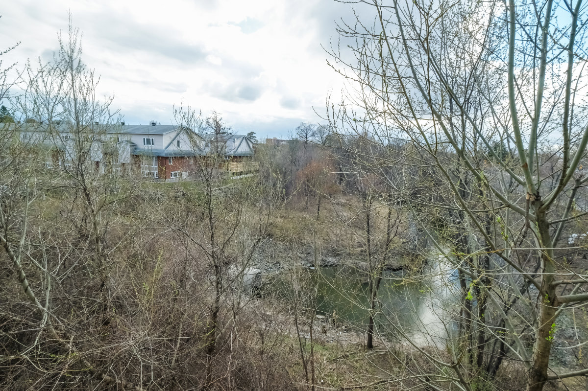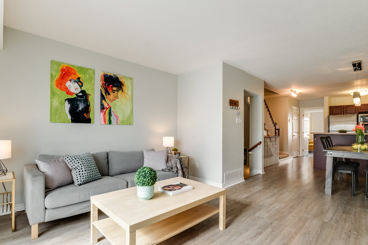 Inside is a bright, open-concept kitchen/living/dining room w/ dark high quality laminate floors, as well as a main floor 2-piece powder room & a massive den. Laminate floors continue in all the rooms upstairs, including the large primary bedroom w/ double closets & another balcony overlooking greenspace.
