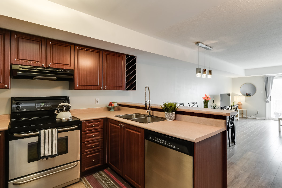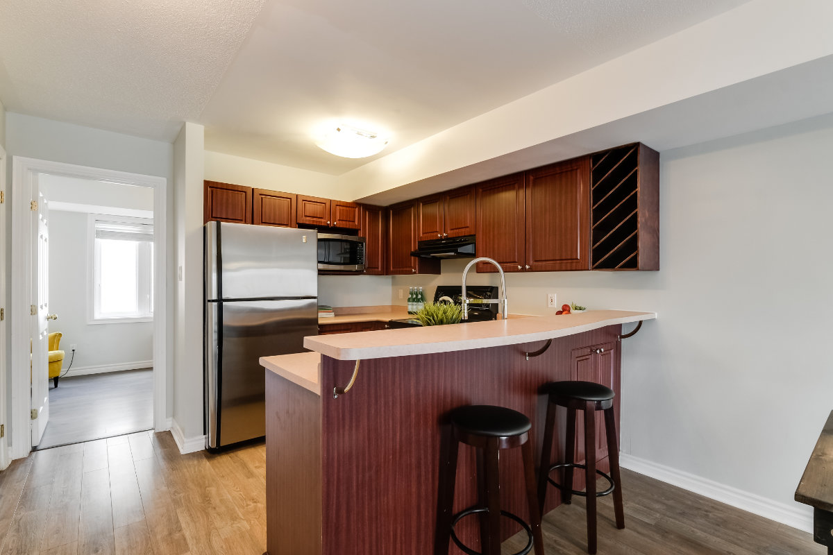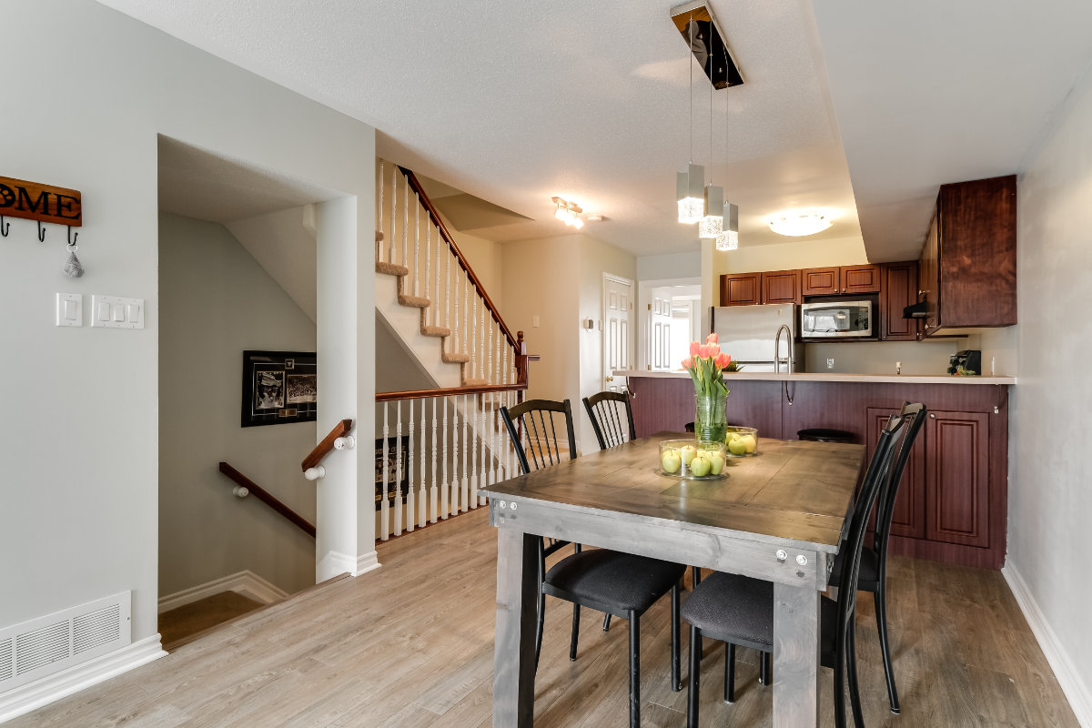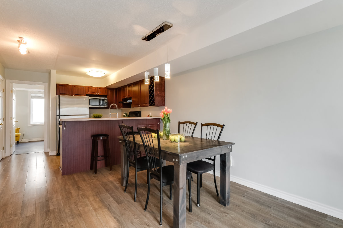 Inside is a bright, open-concept kitchen/living/dining room w/ dark high quality laminate floors, as well as a main floor 2-piece powder room & a massive den. Laminate floors continue in all the rooms upstairs, including the large primary bedroom w/ double closets & another balcony overlooking greenspace.