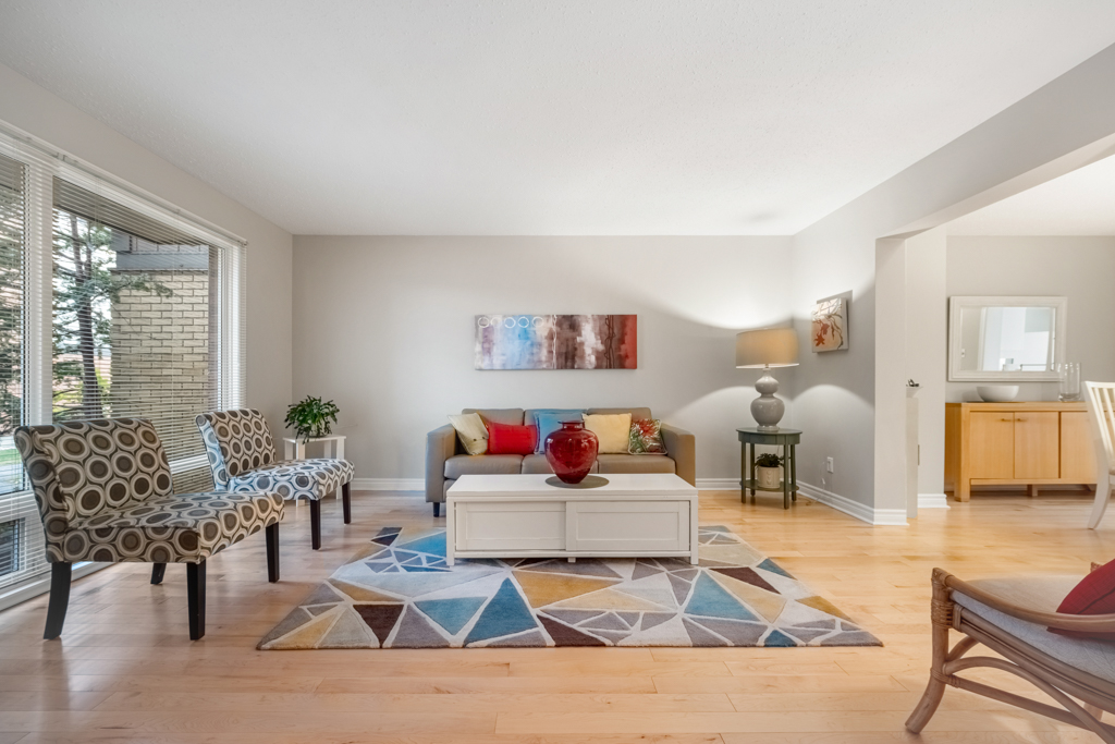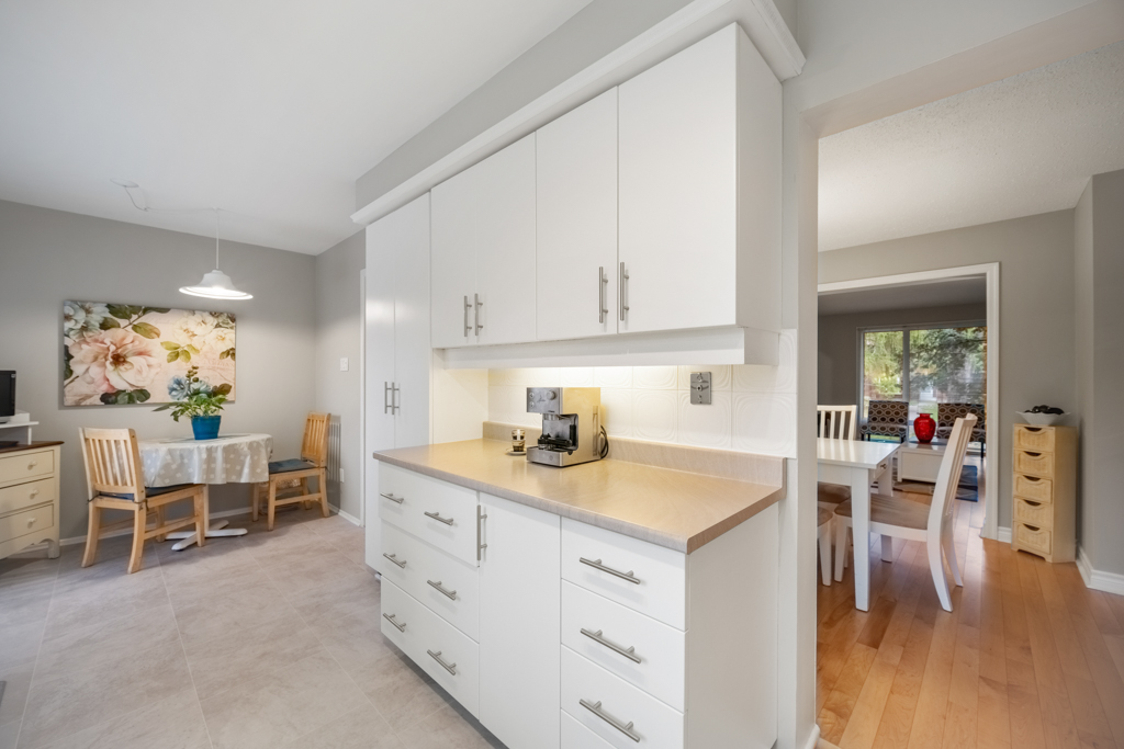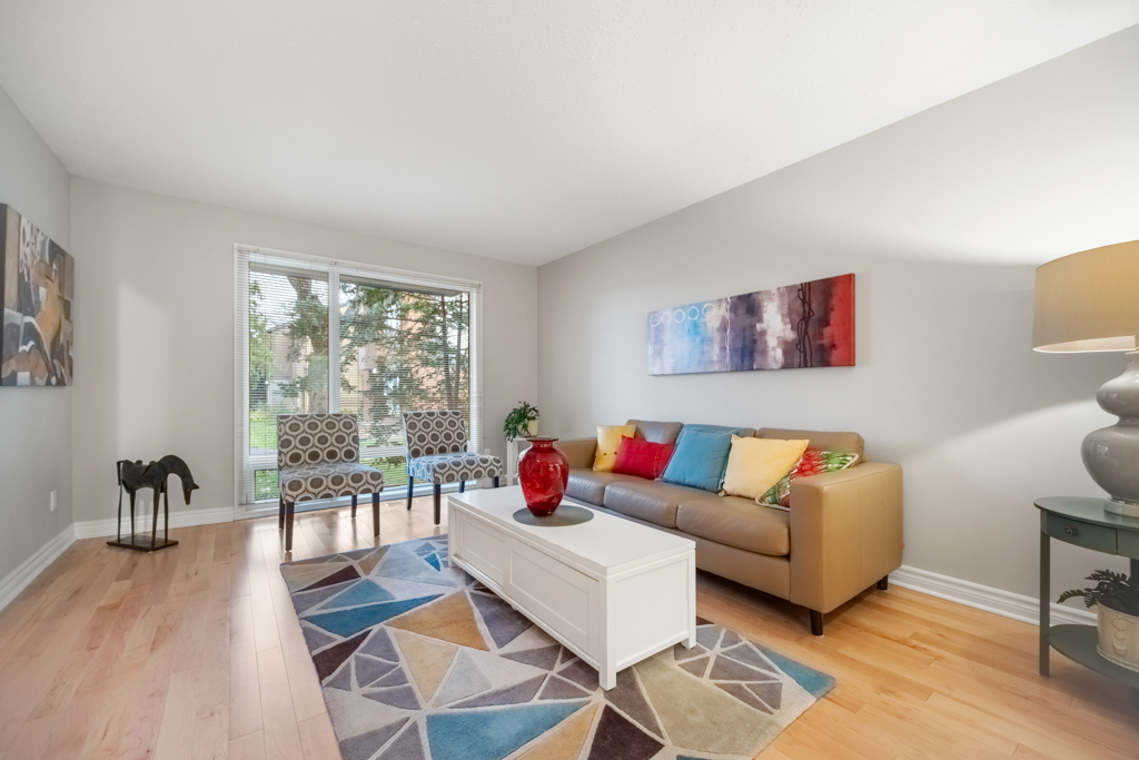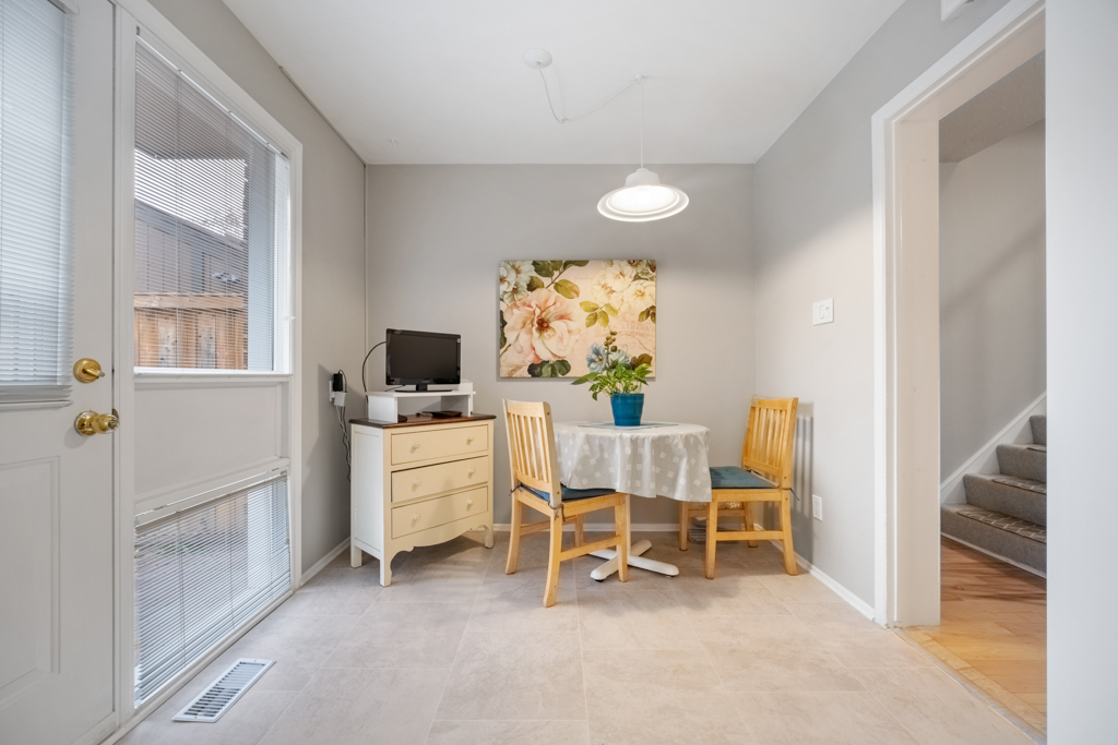 The home is flooded with natural light overlooking the inner courtyard with beautiful mature trees. The open concept living & dining room have beautiful maple hardwood & the kitchen has a great layout with lots of cupboards & counter space & an eating area. Upstairs, two bedrooms have been combined to make a large primary bedroom & offers two other larger bedrooms & a bright full bathroom.