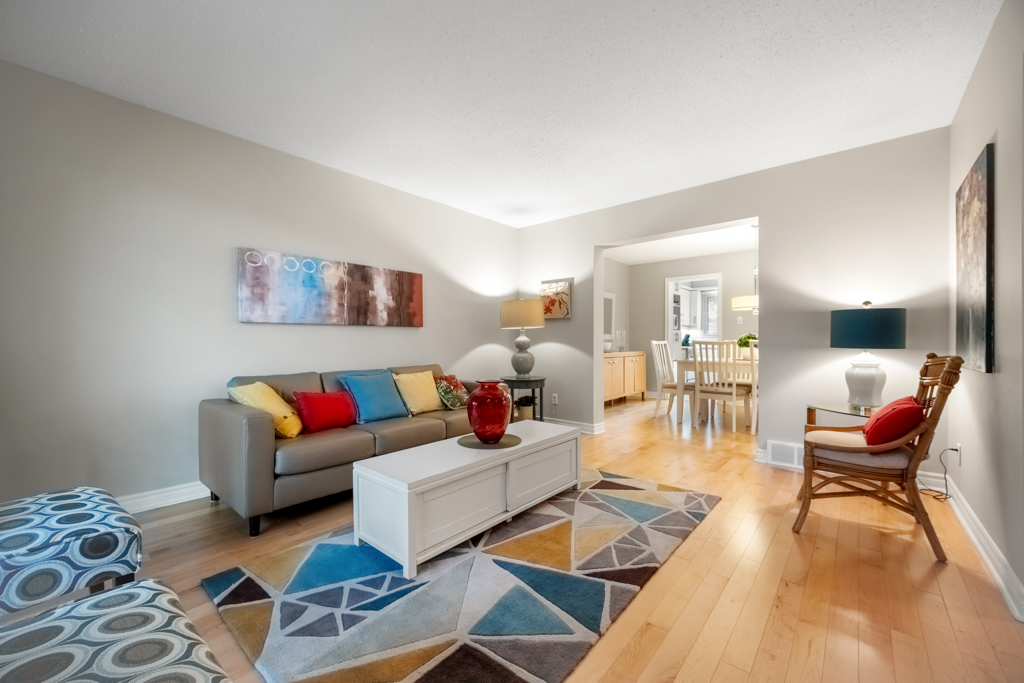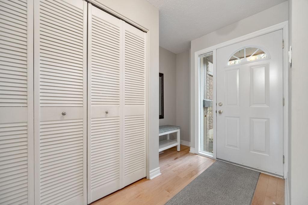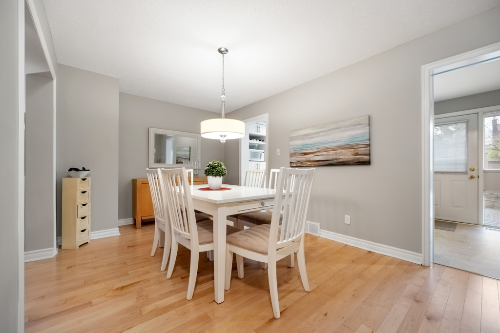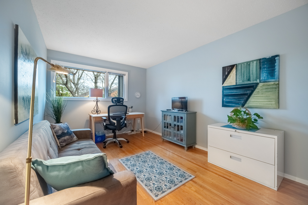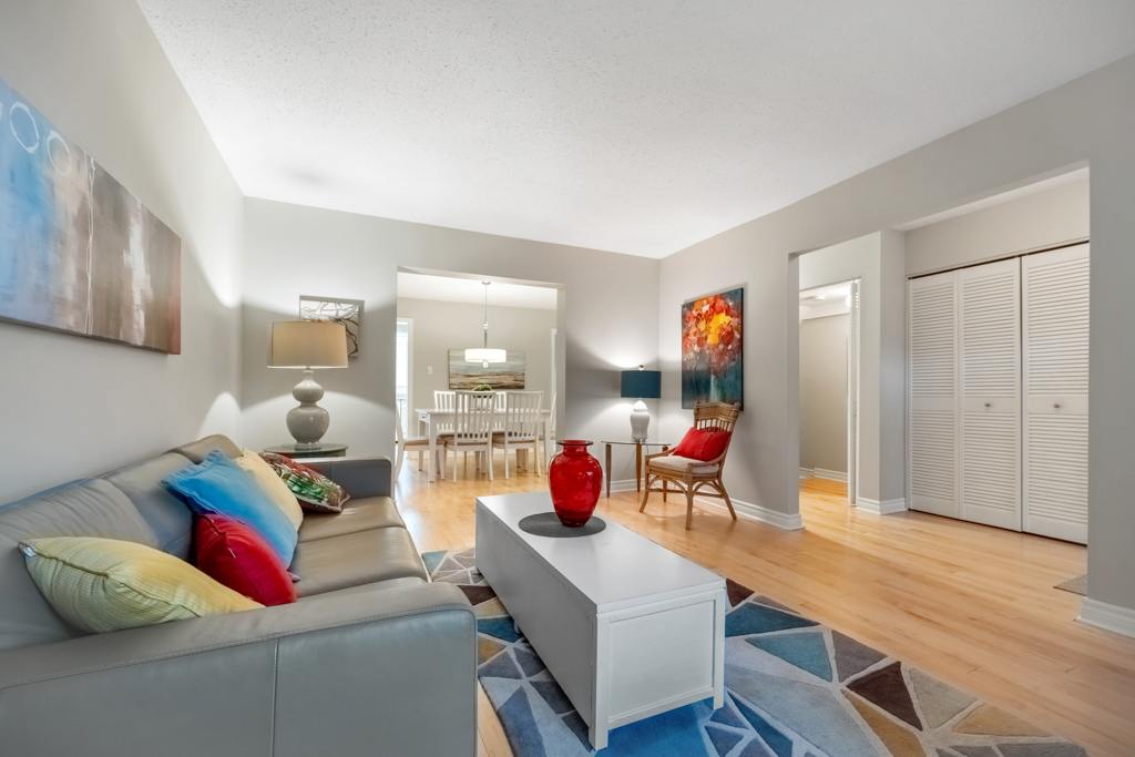 The home is flooded with natural light overlooking the inner courtyard with beautiful mature trees. The open concept living & dining room have beautiful maple hardwood & the kitchen has a great layout with lots of cupboards & counter space & an eating area. Upstairs, two bedrooms have been combined to make a large primary bedroom & offers two other larger bedrooms & a bright full bathroom.
