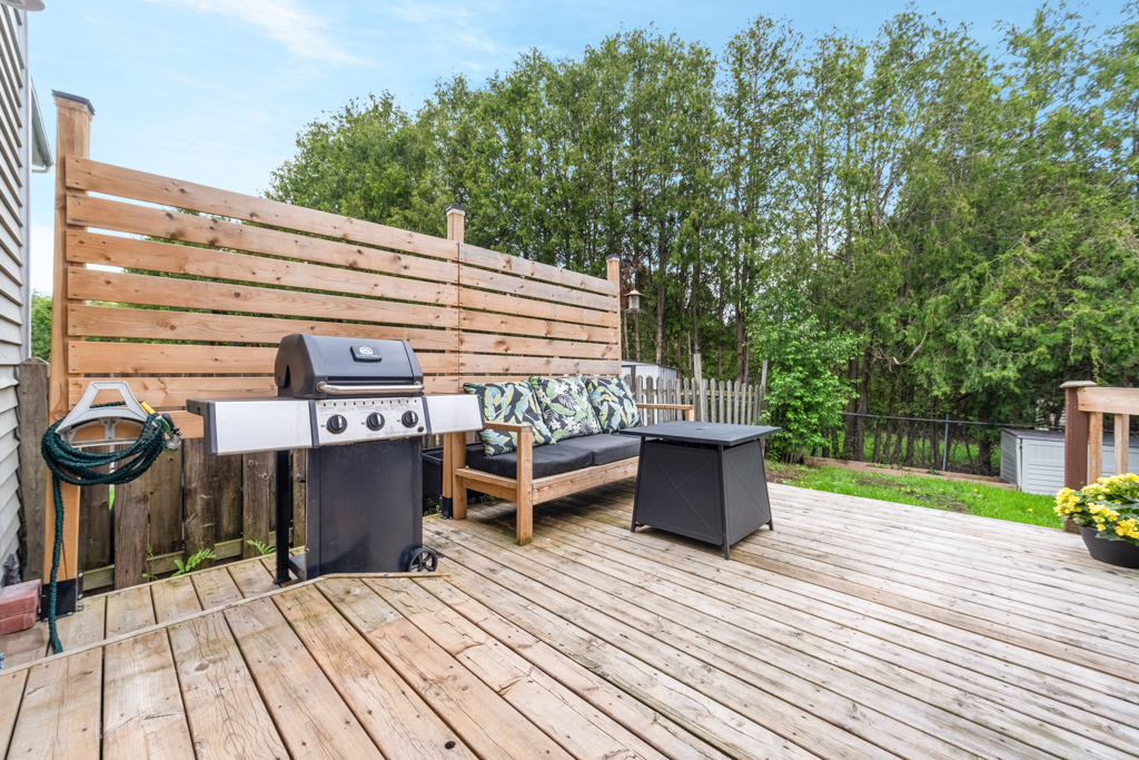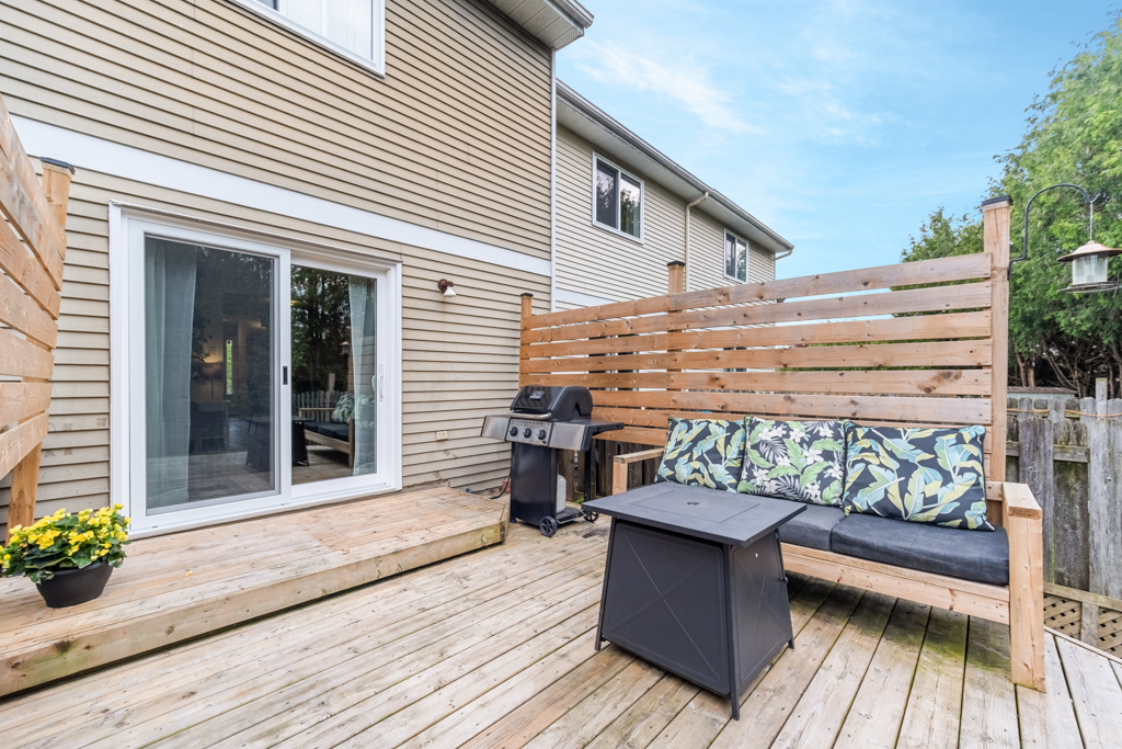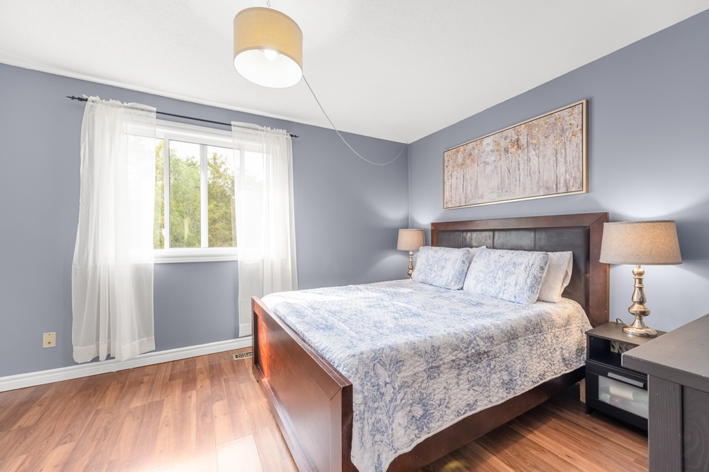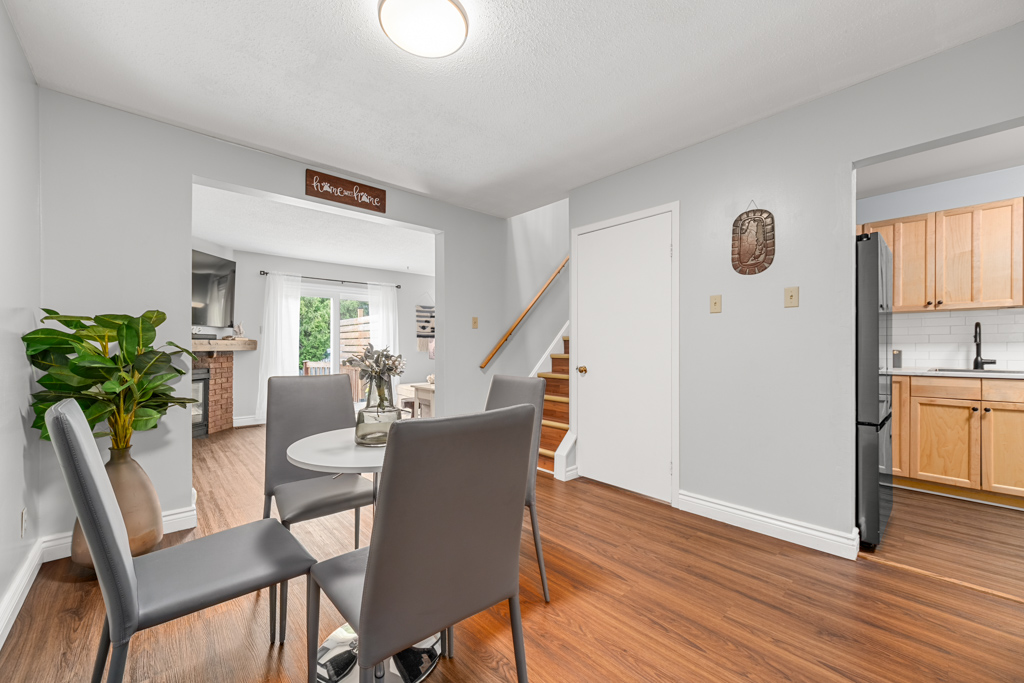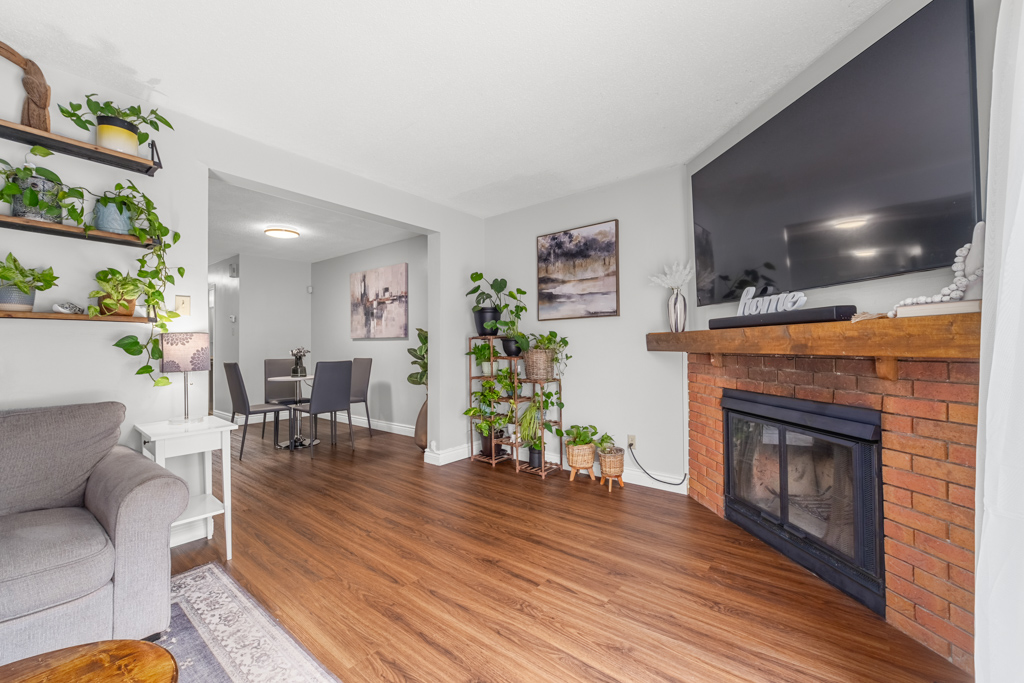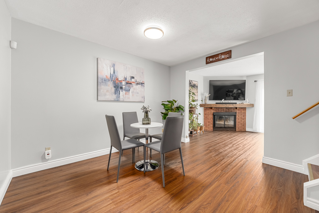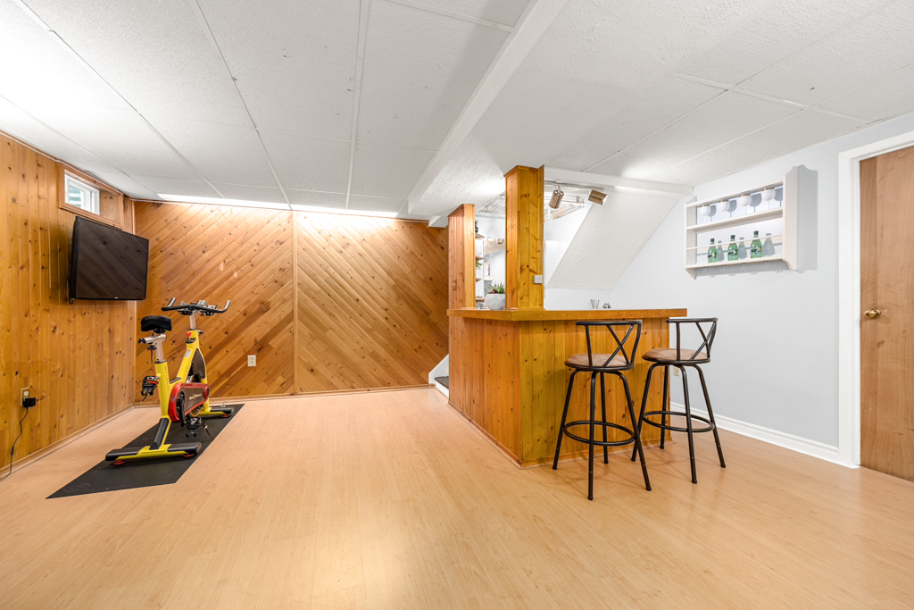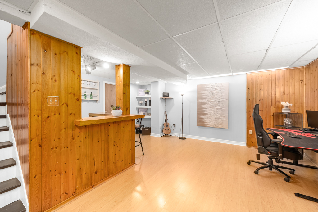 The living room features a wood-burning fireplace with a rustic wood mantle. Upstairs, the primary bedroom has wall-to-wall closets & a full ensuite, along with two additional bedrooms & another full bath. The basement offers a versatile family room, a bar, a utility room with ample storage & a laundry area. The rear yard is fully fenced & extra deep, perfect for entertaining & playing