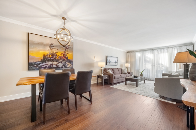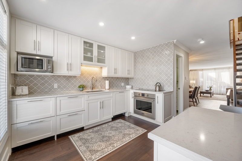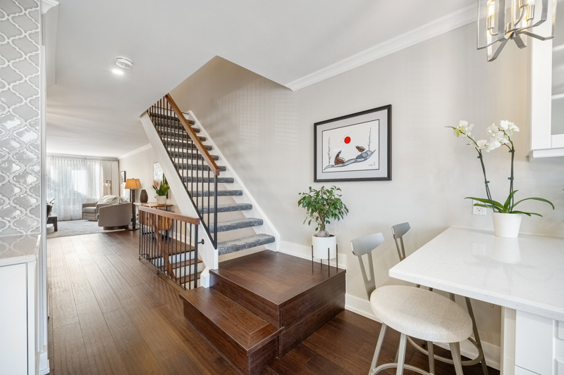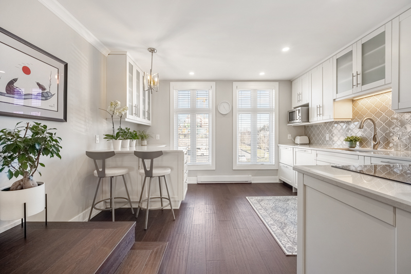 The European-inspired kitchen boasts quartz countertops, a designer backsplash, a breakfast bar and top-tier appliances. A haven for comfort, the main floor hosts a powder room while an outdoor deck overlooks lush gardens and mature trees in the inner courtyard. The upper level boasts 2 spacious bedrooms, a renovated bathroom & convenient laundry. Complete with an underground garage and ample storage, this residence merges sophisticated design with modern living.