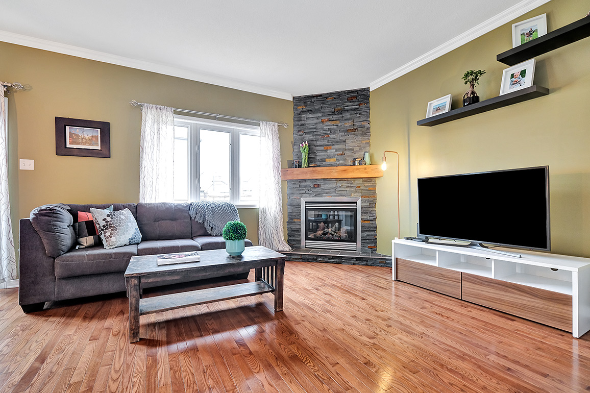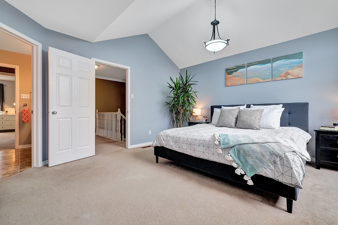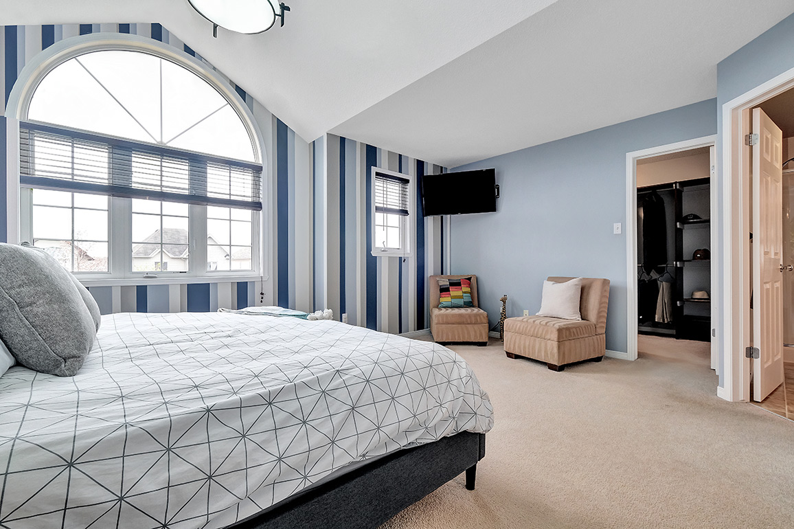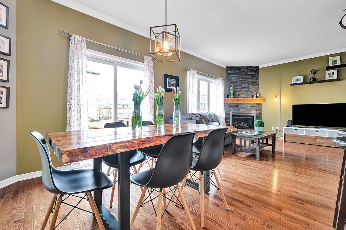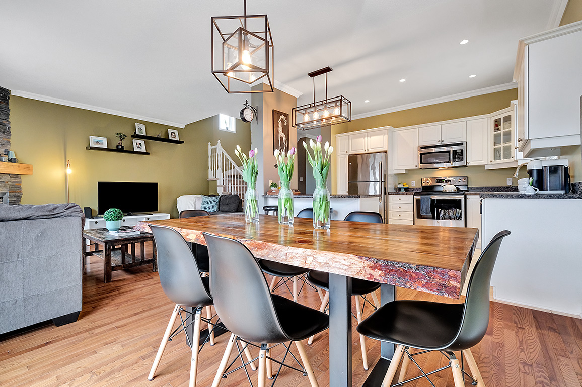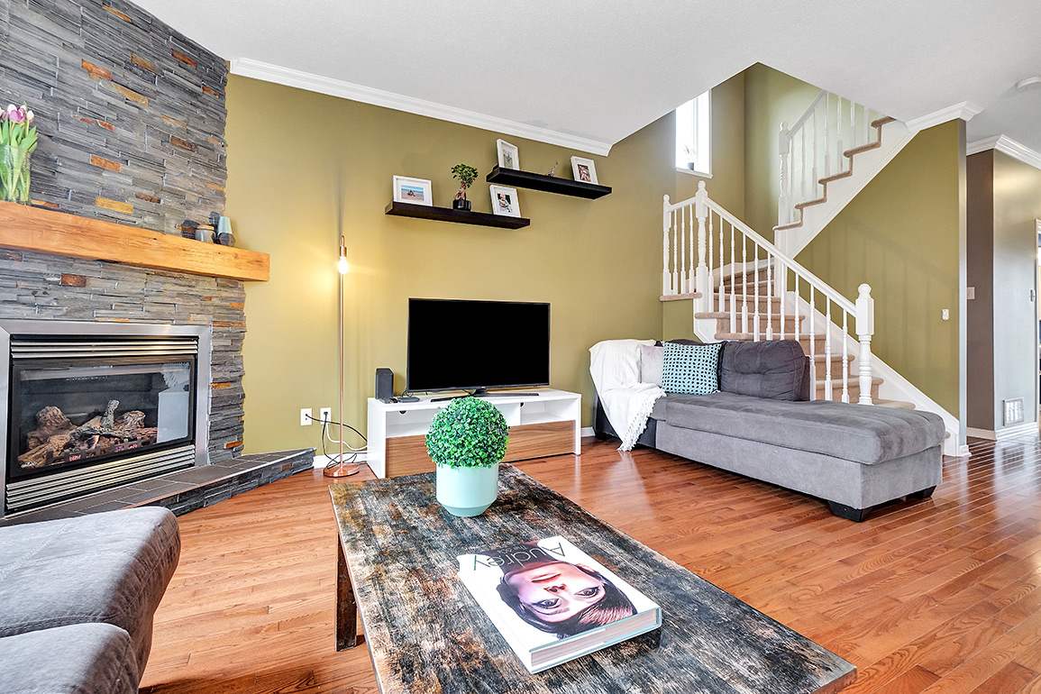 The main floor has a 2-piece bathroom & laundry room with new washer/dryer (2020). Hardwood & tile continue into the open-concept kitchen/dining room & into the living room with a gas fireplace set onto a stone wall with wood mantle. Upstairs, the primary bedroom is bright & spacious & offers a large walk-in closet with built-ins. It shares the 5-piece bathroom with double-vanity, stand-up shower & large soaker tub.