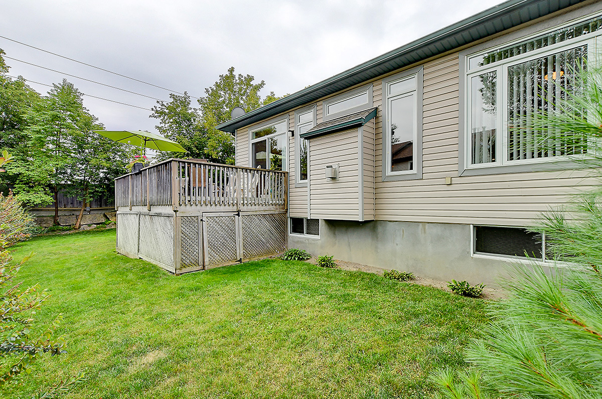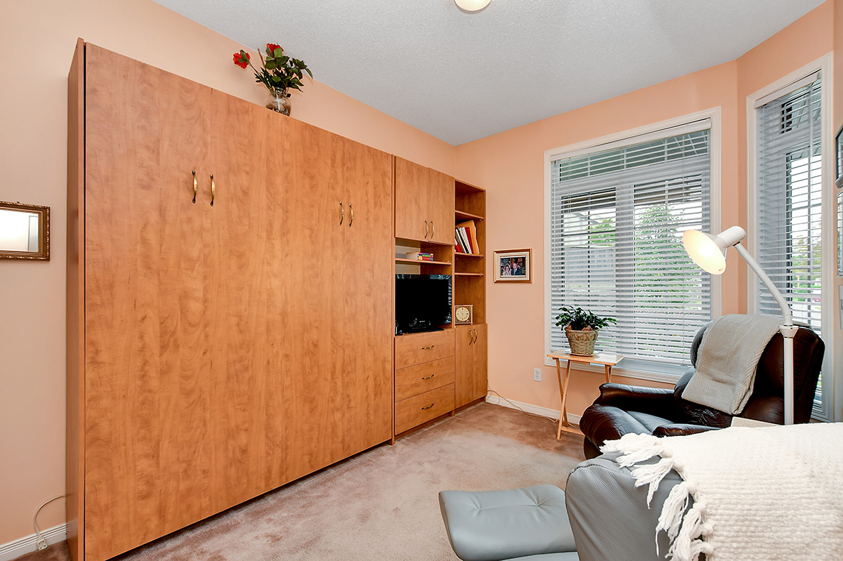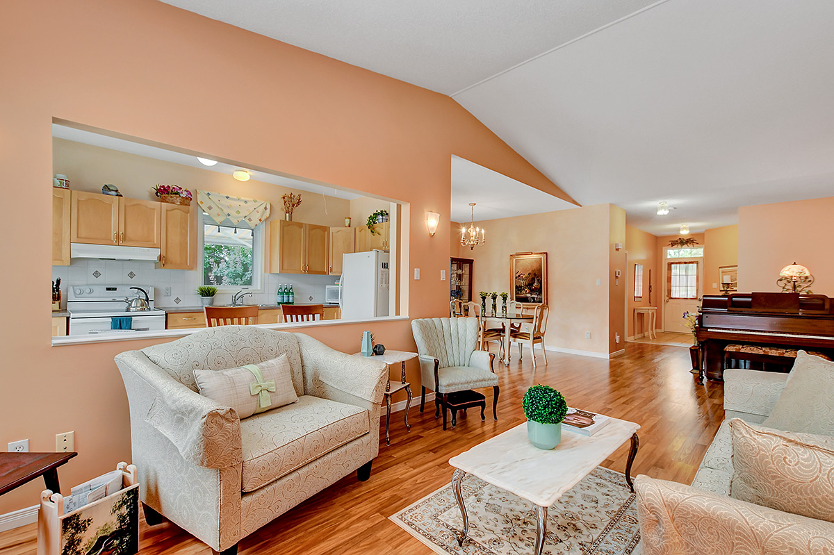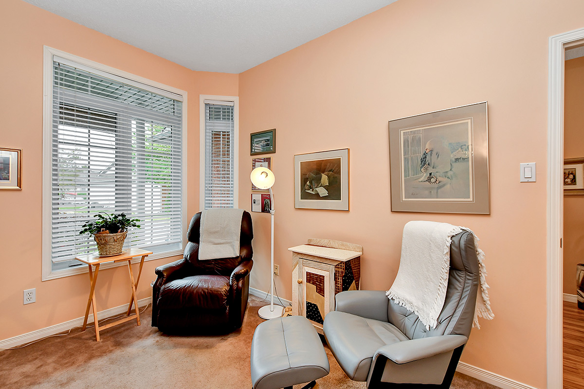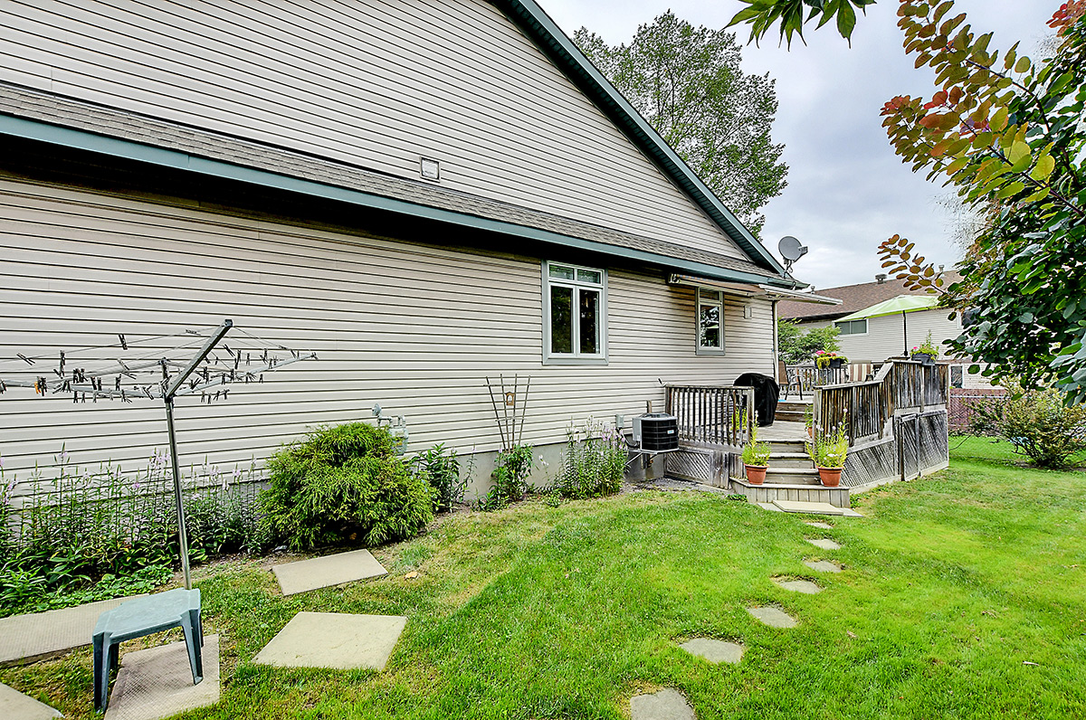 As you walk into the home, you’ll love the cathedral ceilings & natural light. The spacious living room has a natural gas fireplace flanked by two large windows and opens into the kitchen with wood cabinets, plenty of cupboard space and a patio door leading to the deck. The primary bedroom is large and offers a walk-in closet and ensuite with a shower, soaker tub and long vanity. The main floor continues with a 2nd full bathroom, another bedroom currently used as a TV room with a murphy bed, access to the garage and main floor laundry.
