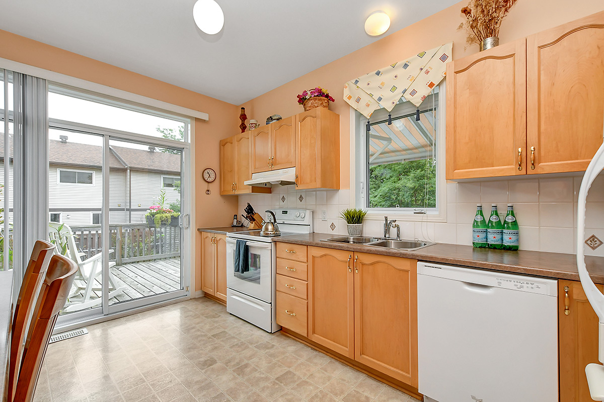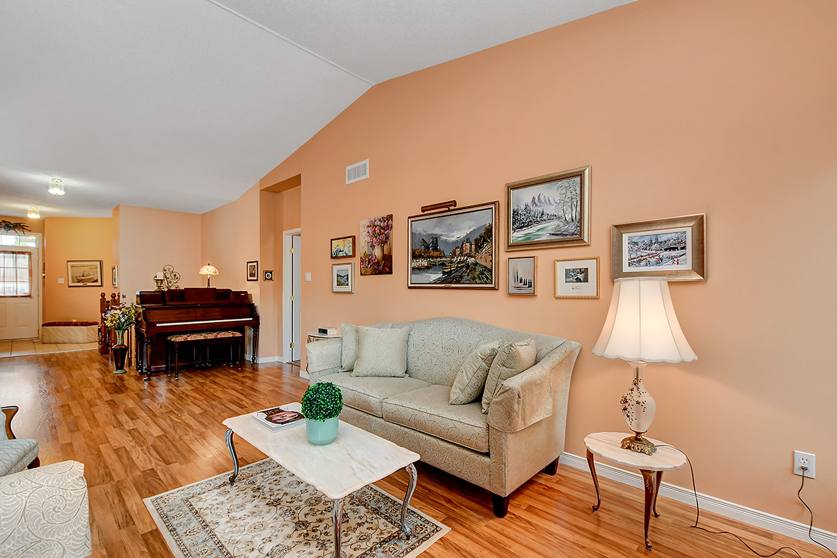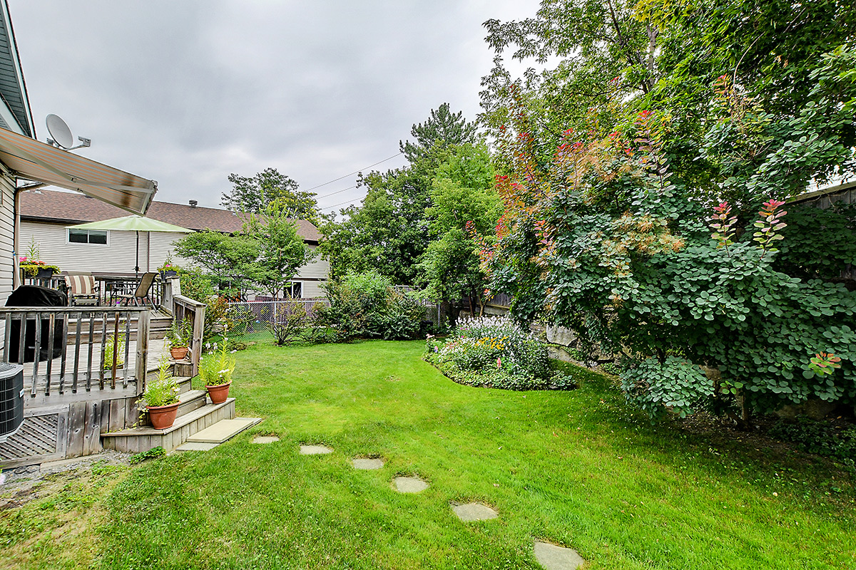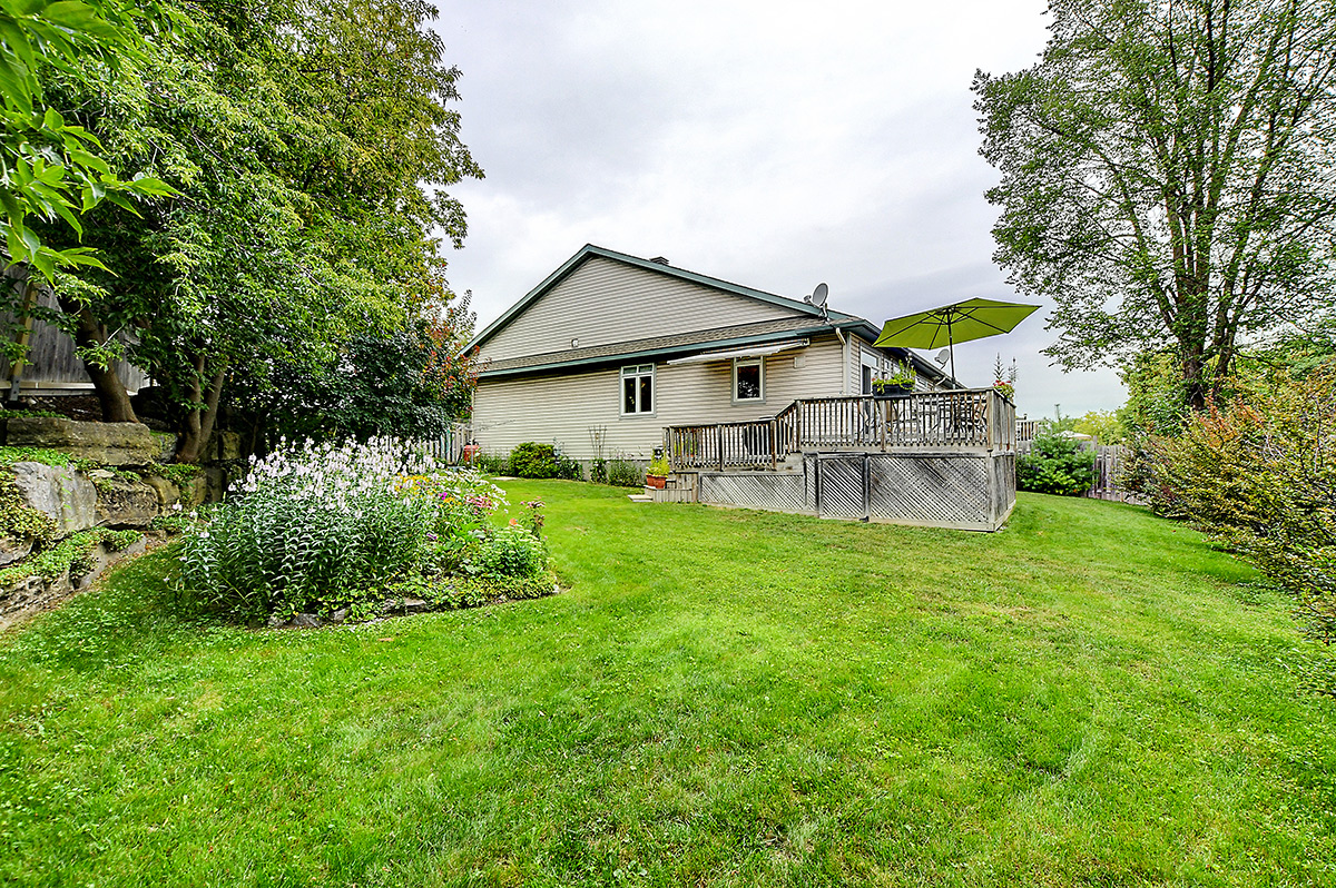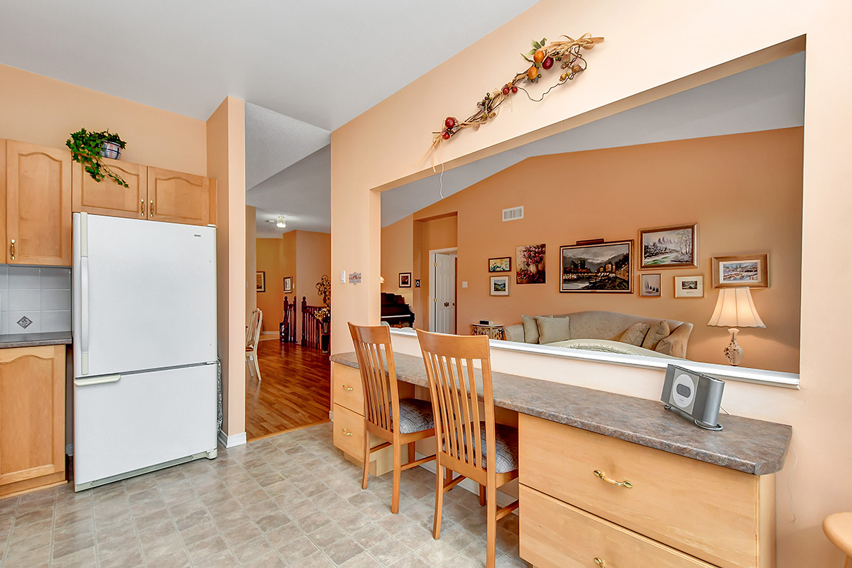 As you walk into the home, you’ll love the cathedral ceilings & natural light. The spacious living room has a natural gas fireplace flanked by two large windows and opens into the kitchen with wood cabinets, plenty of cupboard space and a patio door leading to the deck. The primary bedroom is large and offers a walk-in closet and ensuite with a shower, soaker tub and long vanity. The main floor continues with a 2nd full bathroom, another bedroom currently used as a TV room with a murphy bed, access to the garage and main floor laundry.