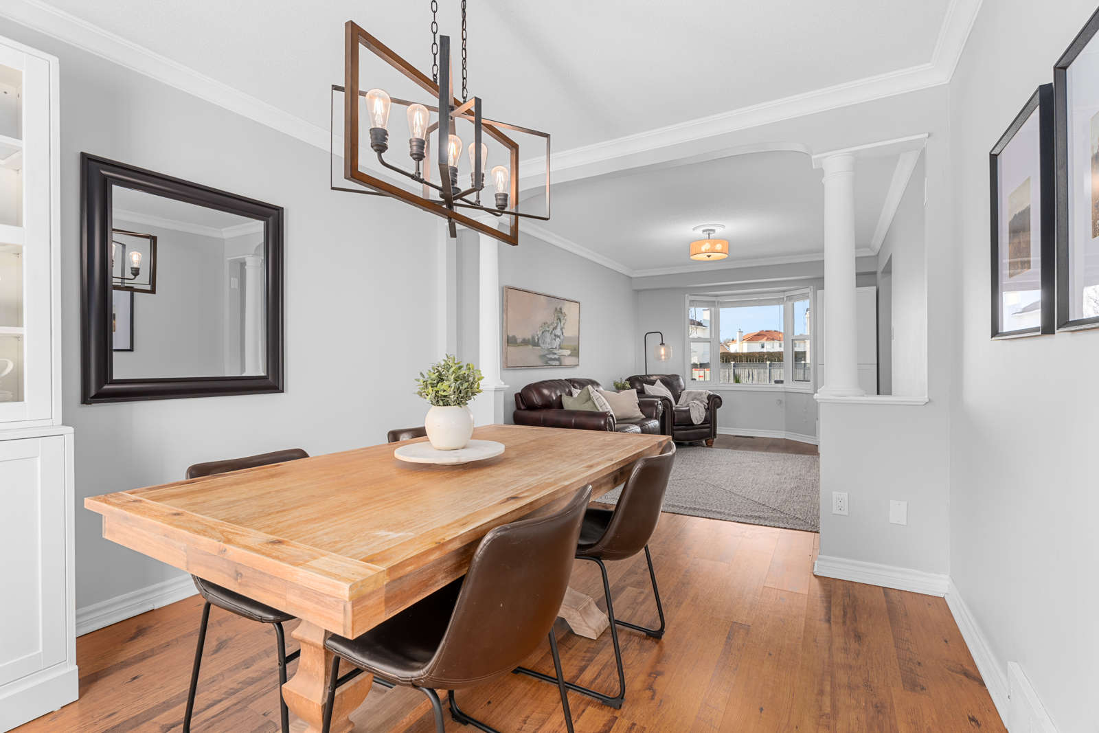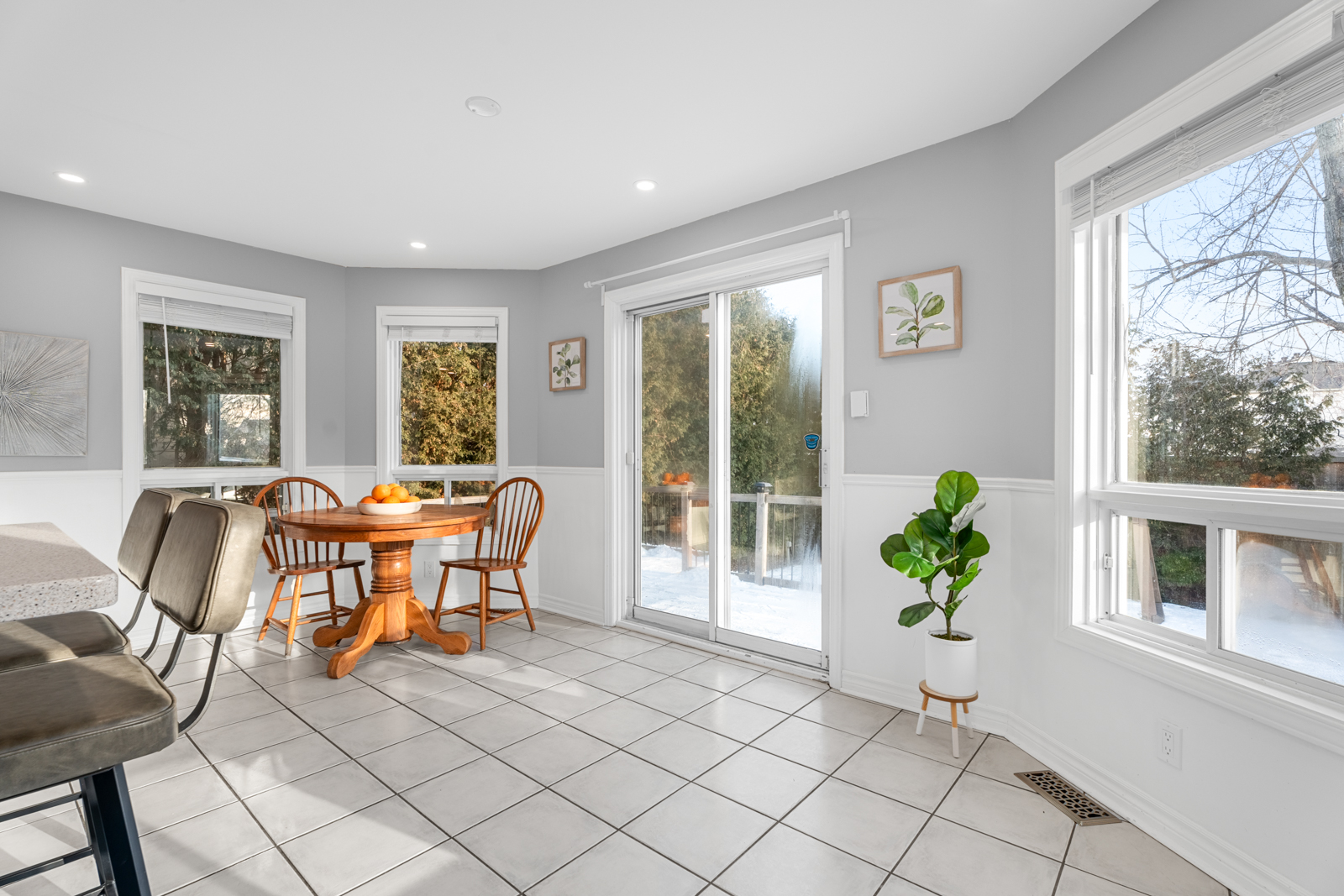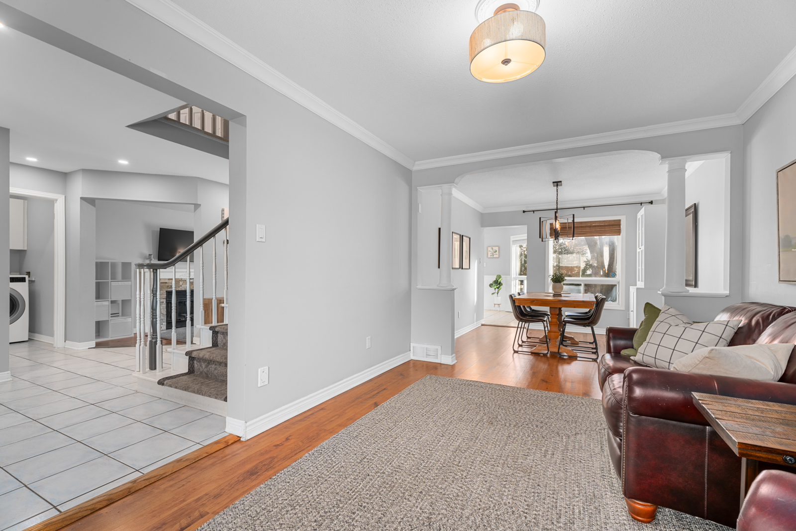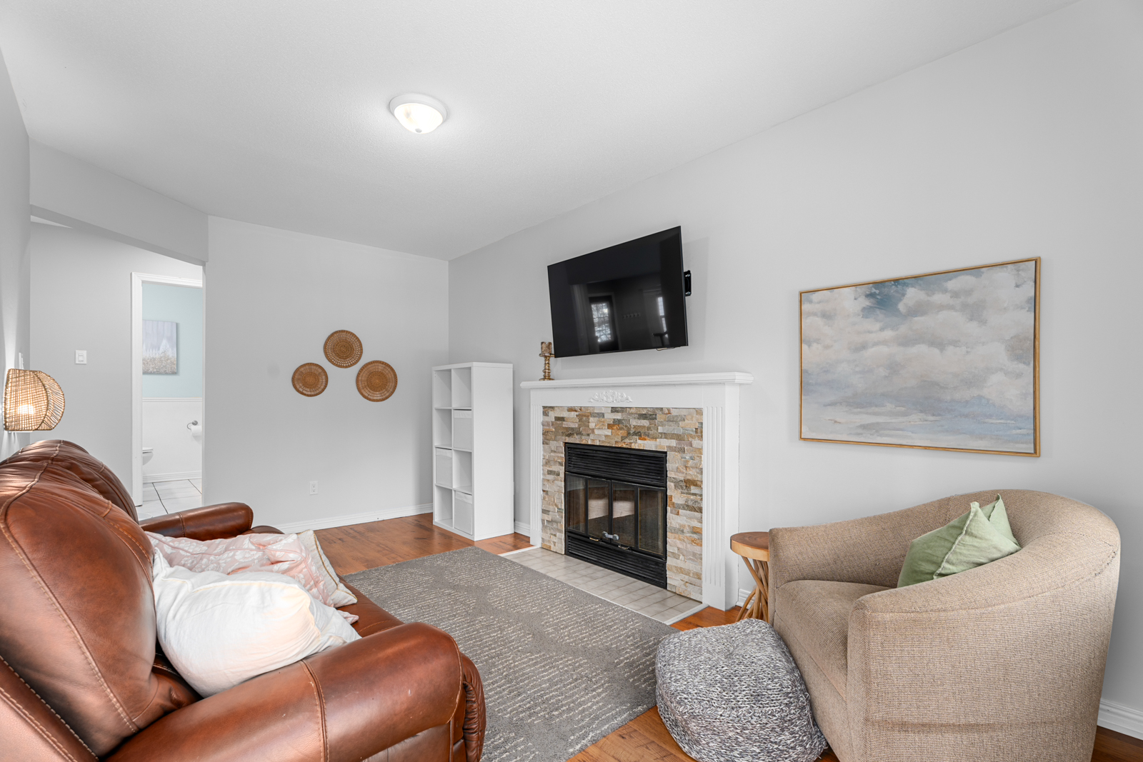 The main floor boasts a functional and inviting layout. A sunny eat-in kitchen with ample cupboard space opens onto a private backyard featuring a spacious deck with no rear neighbours. The family room, complete with a wood-burning fireplace, is perfect for cozy evenings, while the separate dining room and living room provide versatile space for hosting and everyday living. The charming front porch enhances curb appeal and offers a delightful spot to enjoy your morning coffee. Upstairs, the primary bedroom comes complete with a large ensuite featuring a soaker tub, stand-alone shower, and double-sink vanity. The two additional bedrooms share a fully renovated main bathroom, offering both functionality and style.