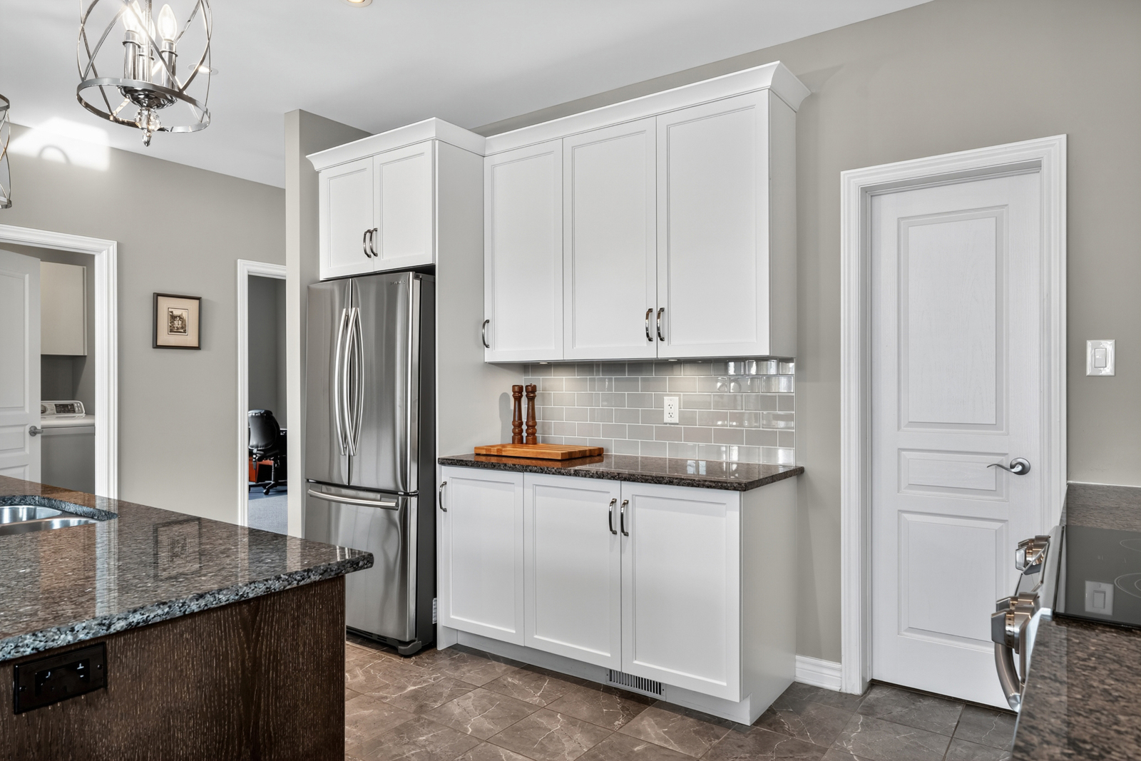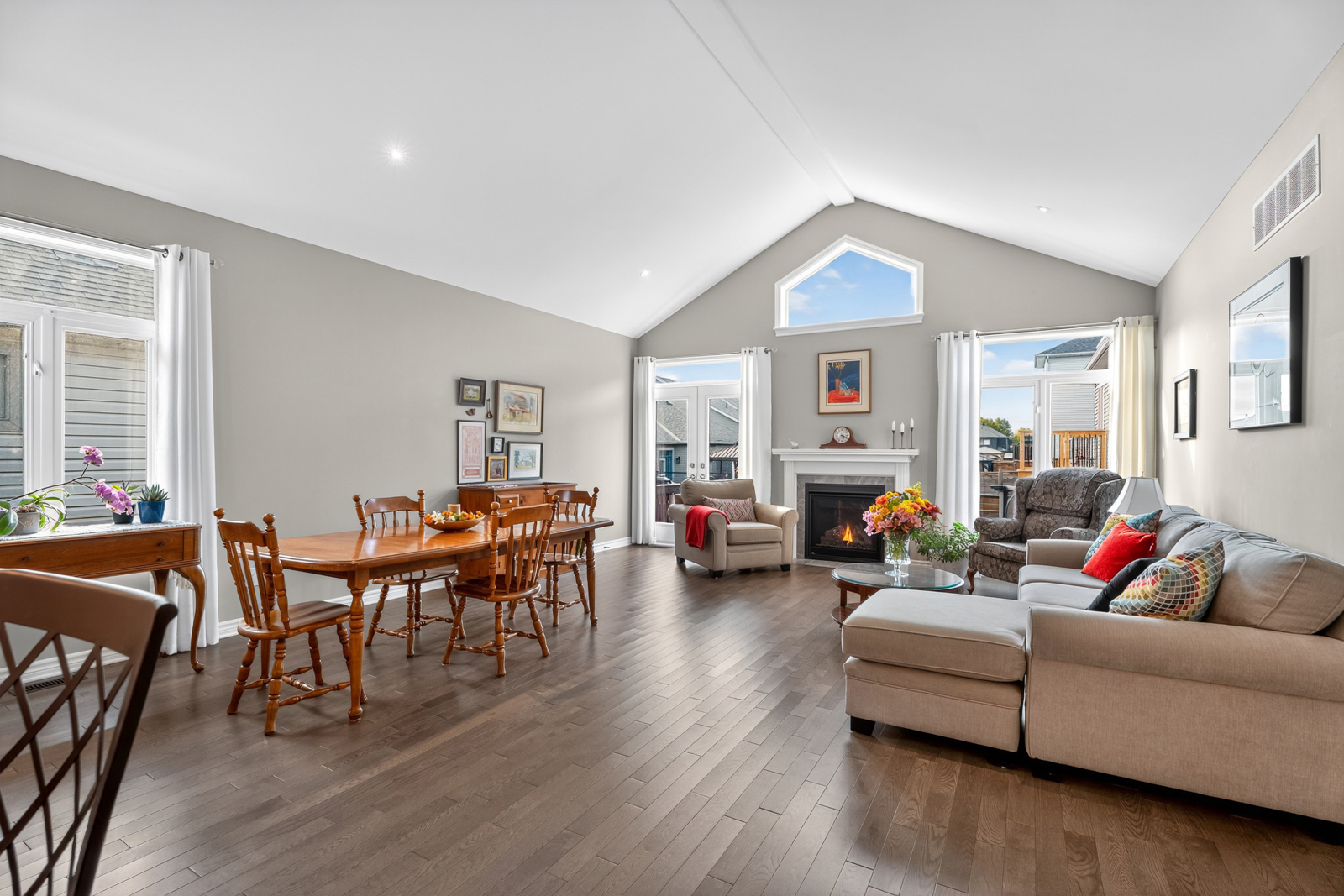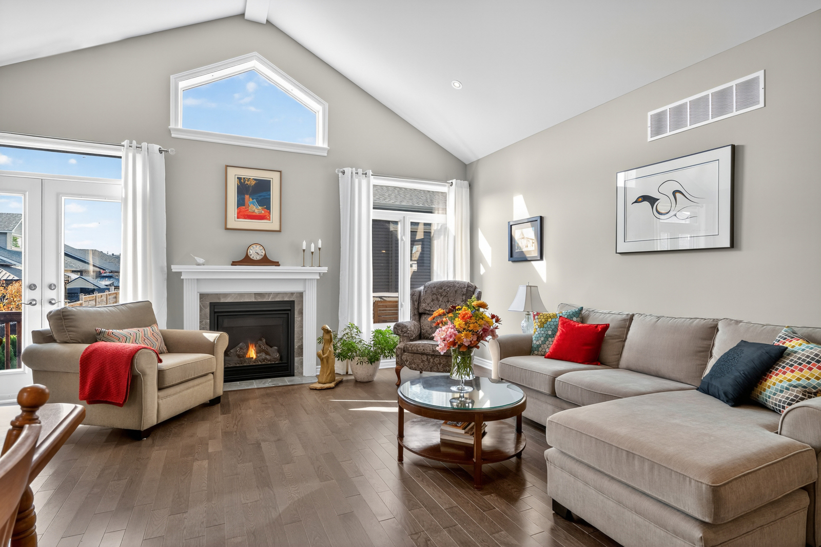 Step inside and discover 1,640 sq. ft. of stylish main floor living with vaulted ceilings, rich hardwood floors, and a cozy gas fireplace anchoring the open-concept design. The chef's kitchen features two-tone cabinetry, granite countertops with a breakfast bar, undercabinet lighting, stainless steel appliances, a walk-in pantry, and a handy alcove with additional cabinetry, perfect for storage or a coffee bar. The main floor offers a thoughtful layout with a primary suite featuring a walk-in closet and a 3-piece ensuite with a stand-up shower. A second bedroom also includes a walk-in closet, while a den at the front of the home makes an ideal office, TV room or reading nook. Another full bathroom, main-floor laundry, and a welcoming covered front porch add to the functionality.