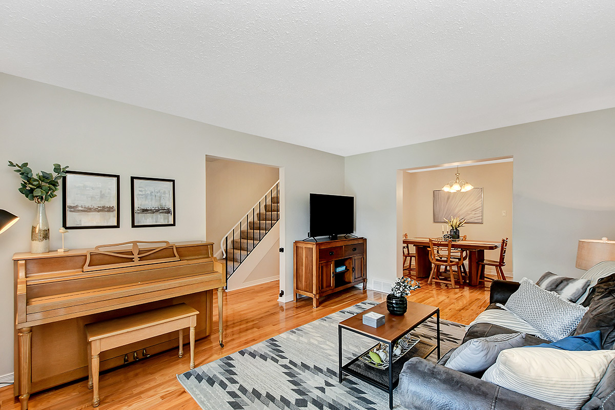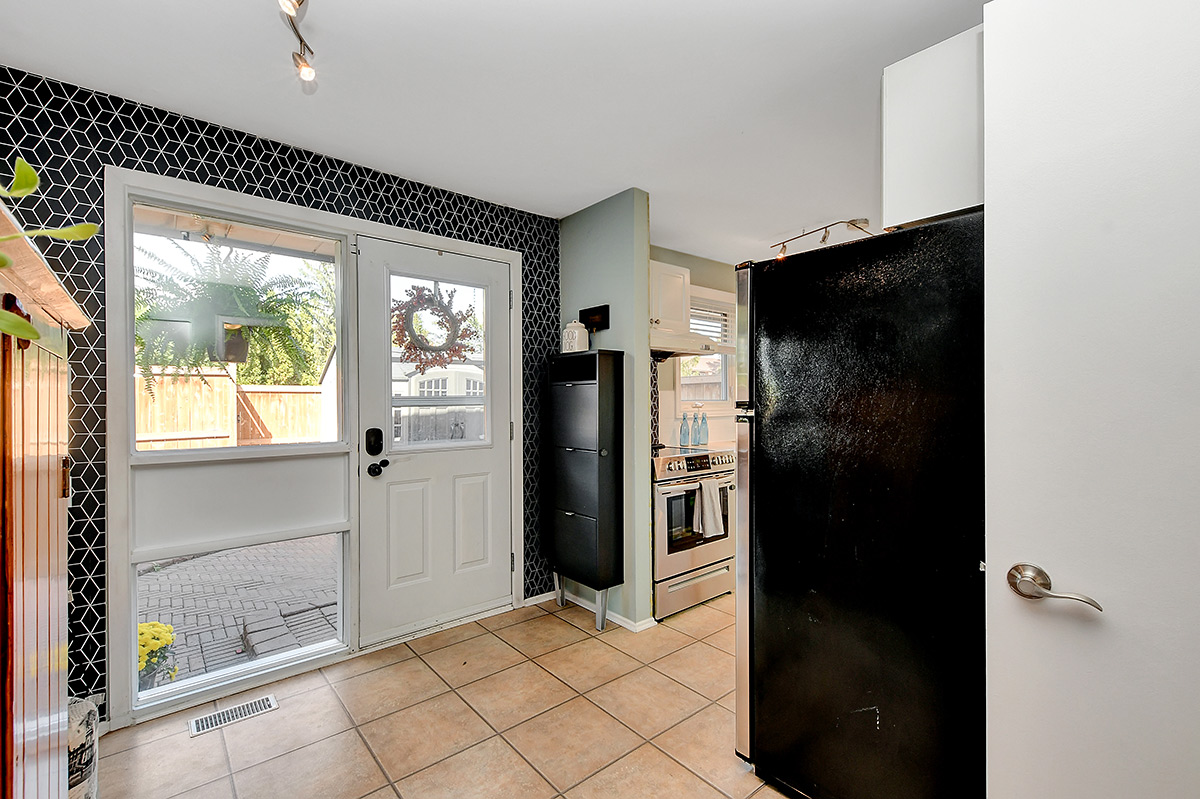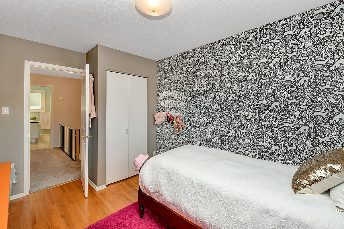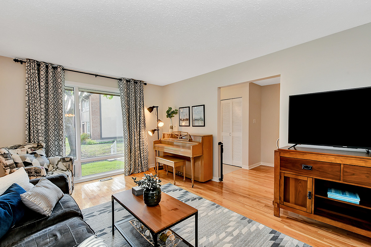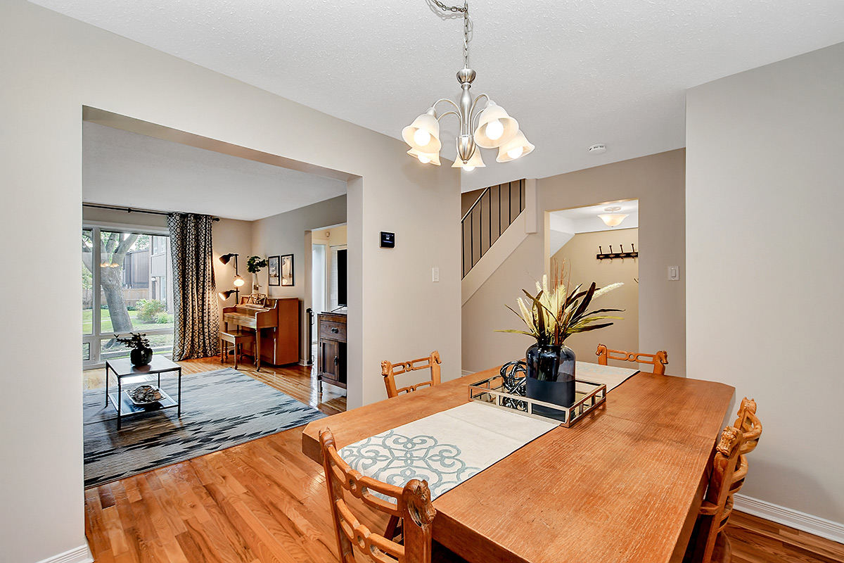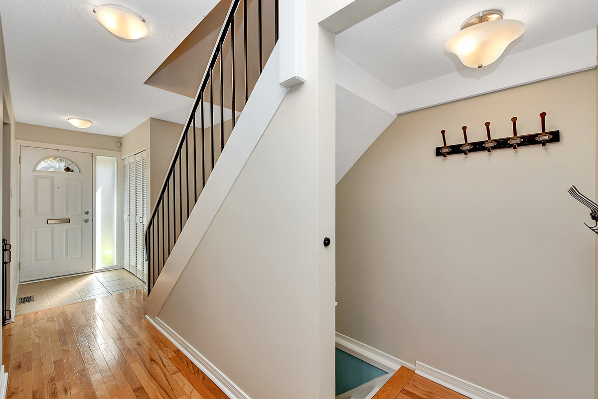The home has hardwood throughout and is flooded with natural light & has been lovingly maintained & updated. It offers a spacious living room with a large window overlooking the courtyard adorned with mature trees & a play area. The updated kitchen offers newer stainless-steel appliances, has a great layout and plenty of cupboards & counterspace. Upstairs are 3 bedrooms with hardwood floors, a walk-in closet in the primary bedroom & a 4-pc bathroom. The basement has great space for living & storage: a large rec room, a storage/laundry rm w/ newer washer/dryer & a powder room. A/C: 2021. Furnace: 2018. HWT: 2017.