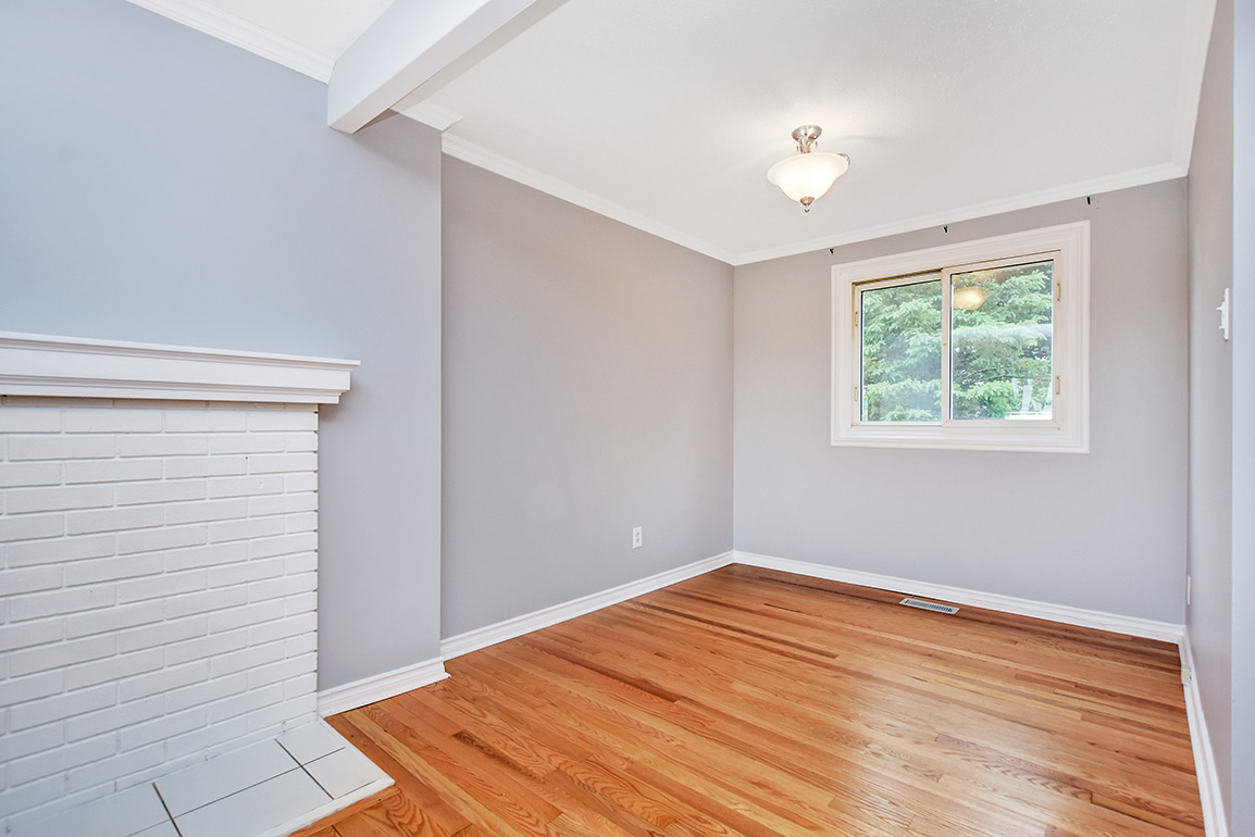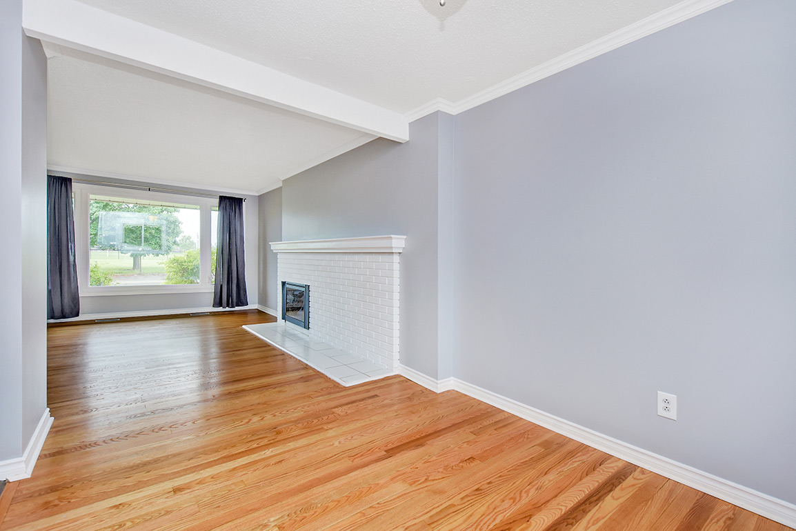 Inside the home, the living room has a white-wash brick fireplace & wood